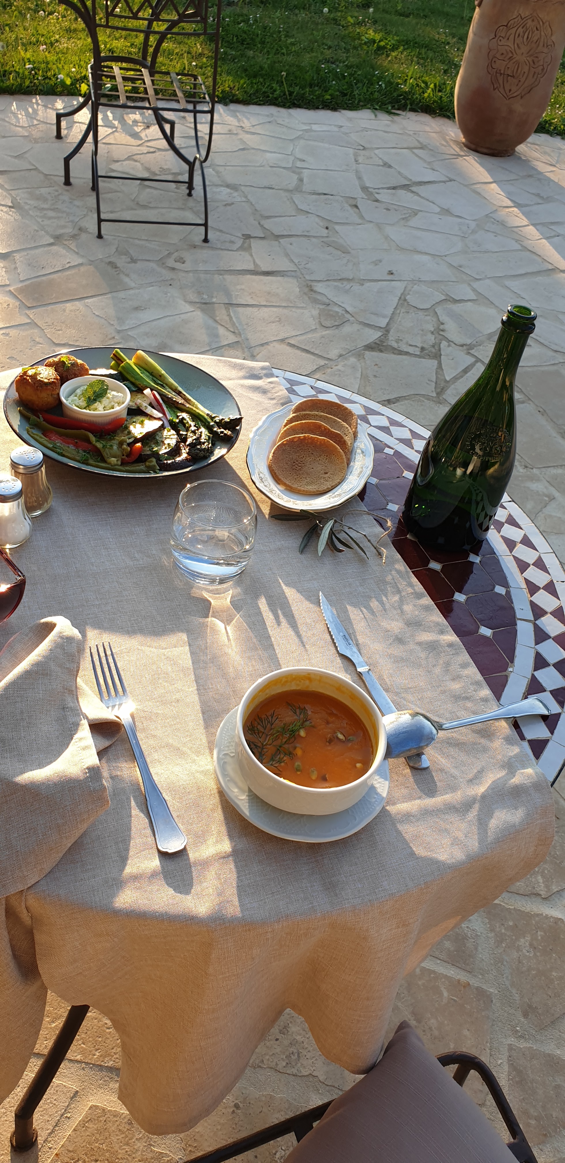 Dîner et nuitée à l’Ermitage dans un cadre magnifique A cause de la Covid, nos hôtes nous avaient concocté un délicieux repas froid/chaud avec des produits maison arrosé d’un cru local ! Petit déjeuner très copieux Et les attentions d’Irina et d’Olivier