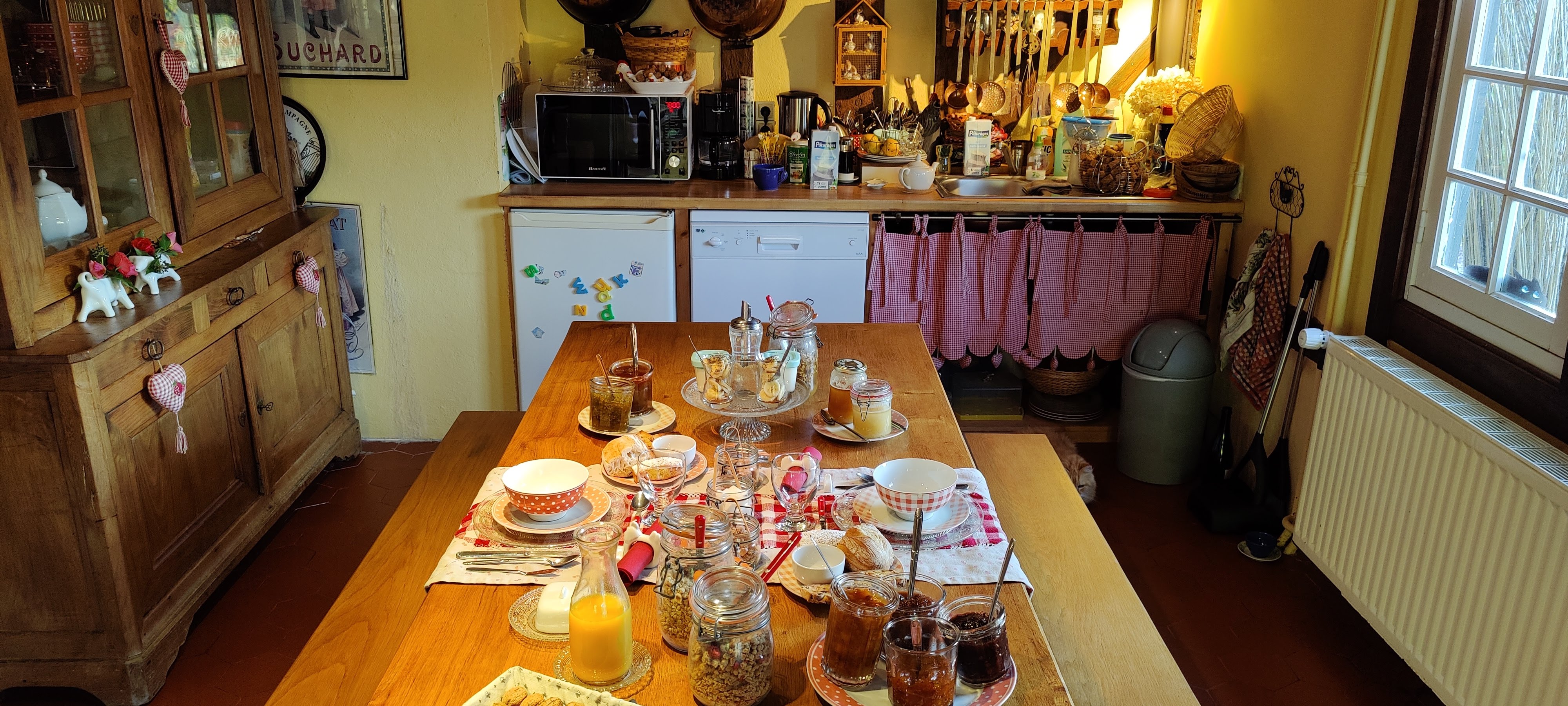 Vous serez accueillis par Marie propriétaire de ces lieux. Elle se chargera de vous expliquer les modalités du séjour ainsi que les endroits a visiter absolument. Après une nuit très agréable et confortable, prenez place dans l'incroyable voyage du petit déjeuner que Marie prend plaisir à vous préparer dans le salon commun. Rencontre discussion et bonne ambiance sont de la partie profitez vous allez vous régalez..!!