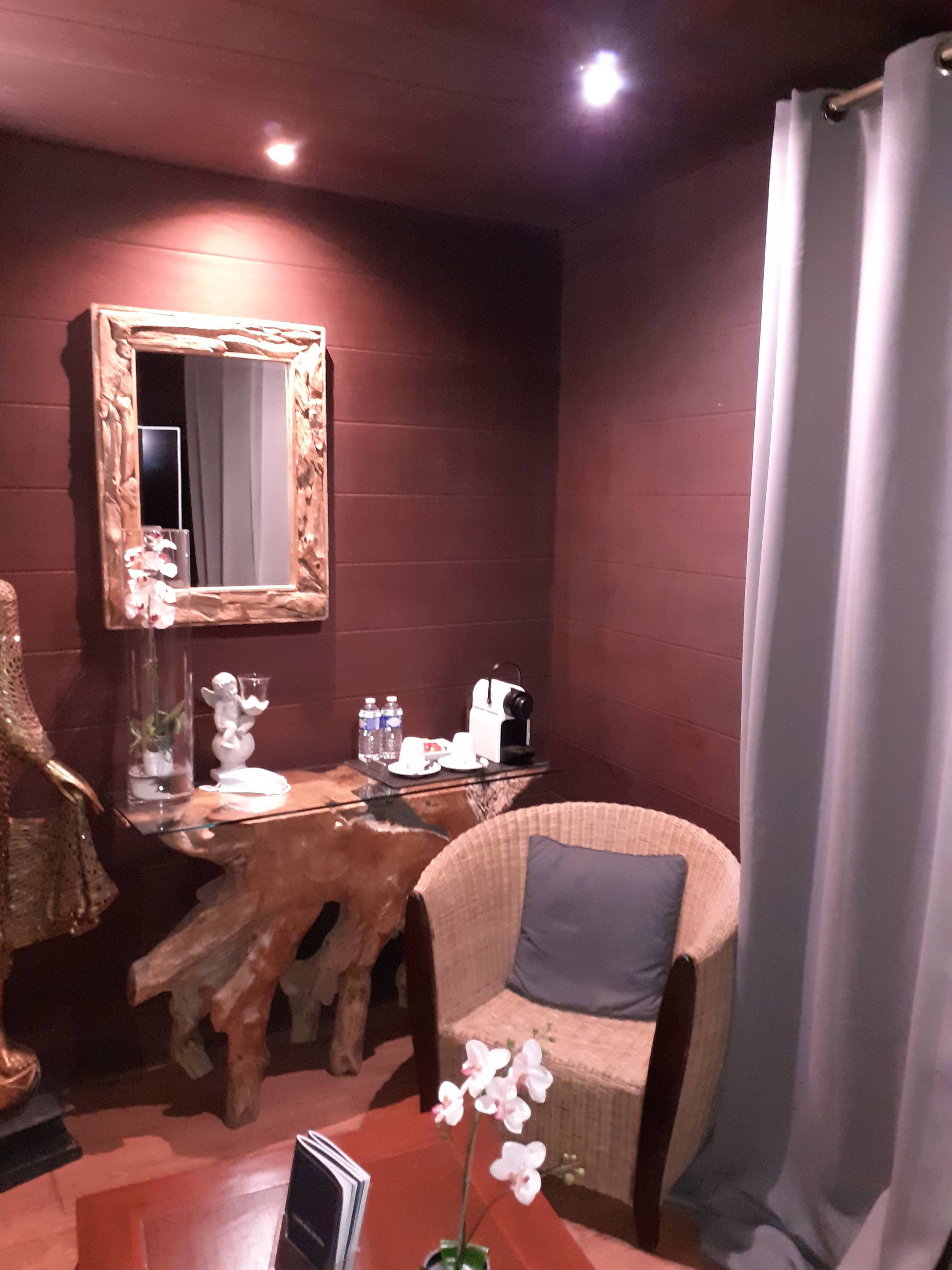 Nous avons réservé la chambre Indonésienne pour une nuit. L'arrivée peut se faire assez tôt (15h) ce qui permet de profiter pleinement de la chambre. Le départ, le lendemain, se fait également assez tard (11h30). La chambre est joliment décorée et aménagée. Nous nous sommes vraiment sentis dans une bulle. Le jacuzzi est en fait une baignoire balnéo mais je ne trouve pas cela dérangeant car finalement plus hygiénique. Il faut cependant compter 1h pour le remplissage. Par ailleurs, il est possible de profiter d'un jacuzzi et d'une piscine couverte, dans une salle annexe commune. La personne nous ayant accueillie était à notre écoute, de bons conseils et bienveillante. Nous avons également pris, en supplément : le massage, qui était vraiment top et super relaxant et le petit-déjeuner, qui était correcte mais plutôt classique. Globalement, nous avons apprécié ces petits-plus mais les avons trouvé un peu cher... Nous recommandons ce site cocooning, qui permet de s'isoler et profiter pleinement d'un moment à deux.