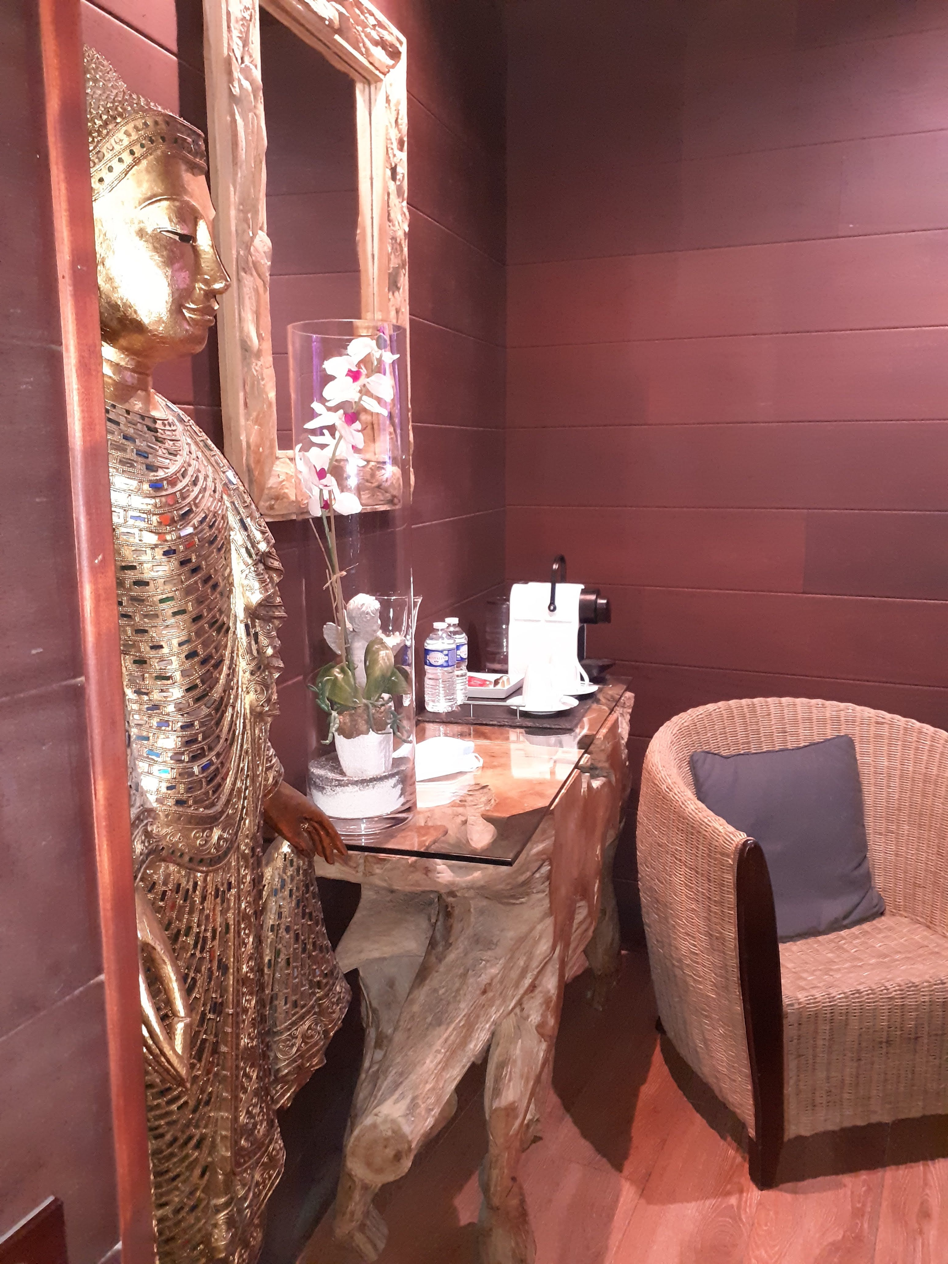 Nous avions réservé la suite indonesienne, la déco est superbe , et le jacuzzi privatif ainsi que la terrasse est un vrai +! le cadre est calme et reposant. Le petit déjeuner servi sous forme de buffet est complet et bon. Je recommande ! Nous reviendrons!