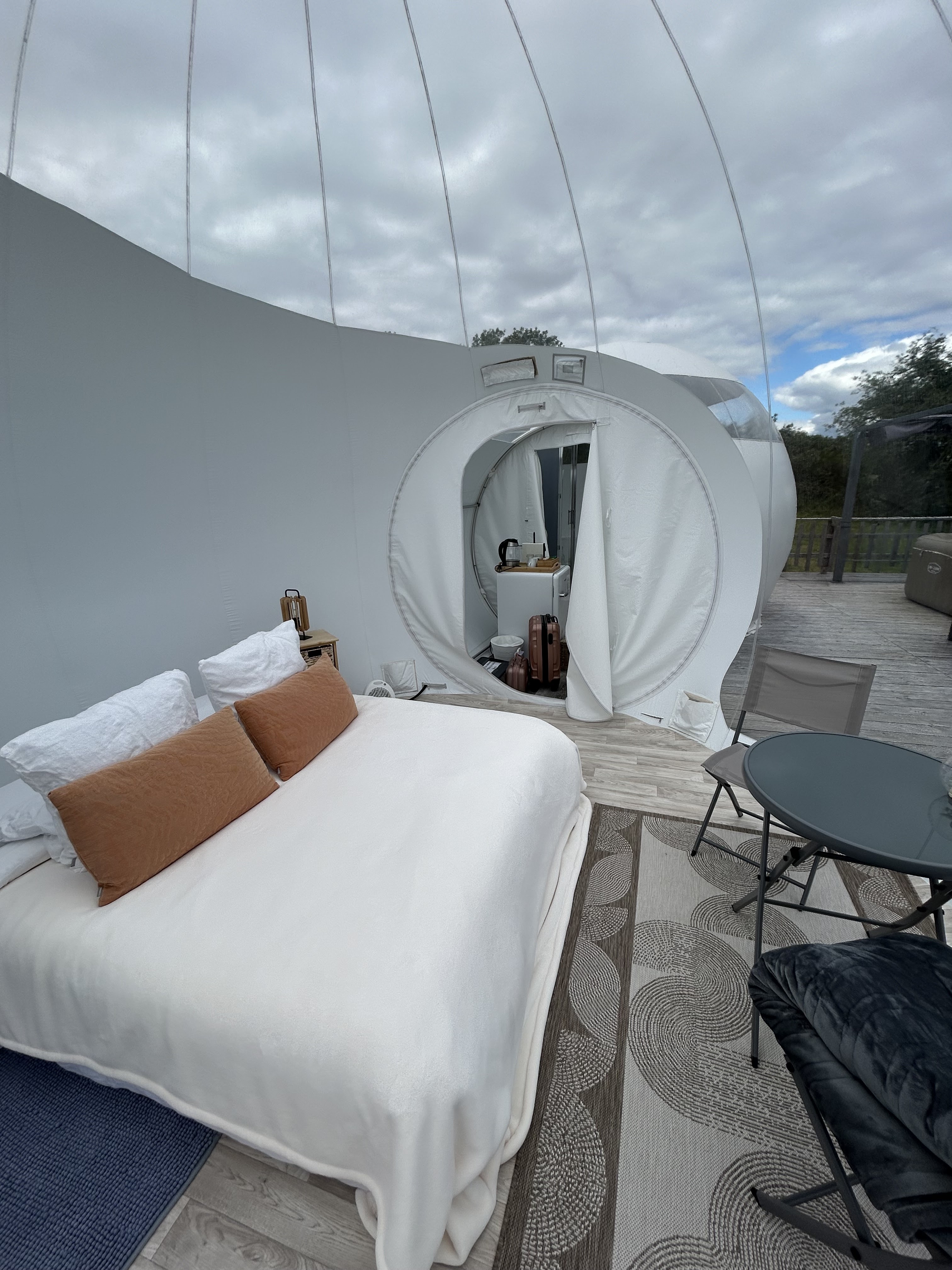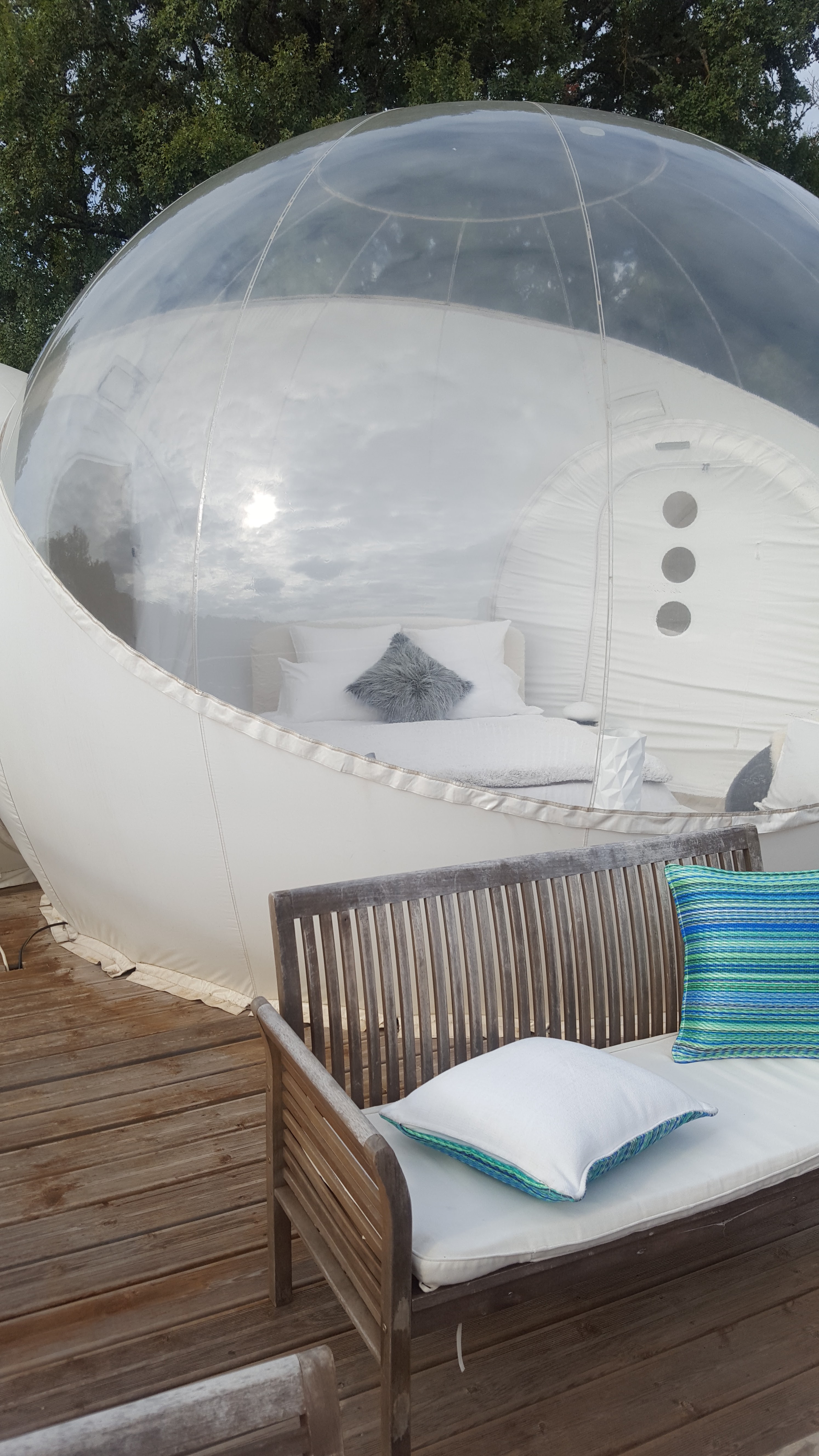 Séjour médiocre... deux nuits réservées en cadeau par notre fille, nous rêvions avec ma femme de tester ce genre de bulles. Quelle ne fut pas notre surprise quand nous avons découvert celles-ci... le lit était sale et il faisait (EXTEMEMENT) chaud, nous n'avons pas pu fermer l'œil de la nuit. Nous avons été également réveillés par l'alarme de la piscine... aussi n'arrivez pas avec 15 minutes de retard sinon vous aurez droit aux remarques désagréables de la propriétaire qui devrait apprendre à être plus agréable avec ses clients qui payent quand même 150 euros la nuit ce n'est pas rien!